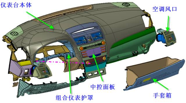 主要包括主儀表臺總成、儀表臺管梁總成、副儀表臺總成。