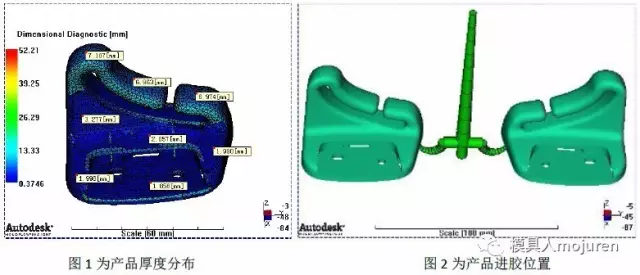 此產(chǎn)品為汽車安全帶固定件: 產(chǎn)品最大外形尺寸:70*45*63,產(chǎn)品平均肉厚:1.8~7.0mm,產(chǎn)品肉厚差異較大,因此采用3D網(wǎng)格分析,如圖1所示。材料:ABS+PA6-GF8 Terblend N NG-02 : BASF .此材料已做修正,質(zhì)量指示器為銀級,此材料可信度較高。 模具為一模兩件,由于產(chǎn)品量大,因此進膠方式為冷流道隧道澆口進膠,如圖2所示。