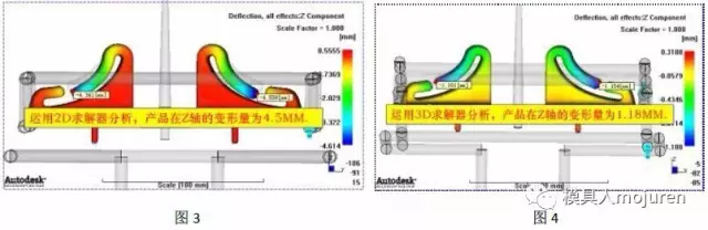 此產(chǎn)品雖有拐角,但不可使用雙層面網(wǎng)格含有拐角效應(yīng)的選項進行分析,由于此產(chǎn)品的形狀、壁厚分部不均且壁厚變化較大已不符合使用雙層面網(wǎng)格的要求(在這里我用雙層面網(wǎng)格分析了一下,如圖3所示。分析出的變形高達(dá)4.5MM),因此采用3D網(wǎng)格分析,分析出來的產(chǎn)品最大變形為1.18MM,如圖4所示。